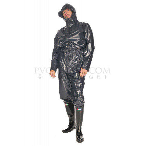 Overall aus PVC für Ihn. Mit großer Kapuze, Frontreißverschluss und elastischen Bündchen.